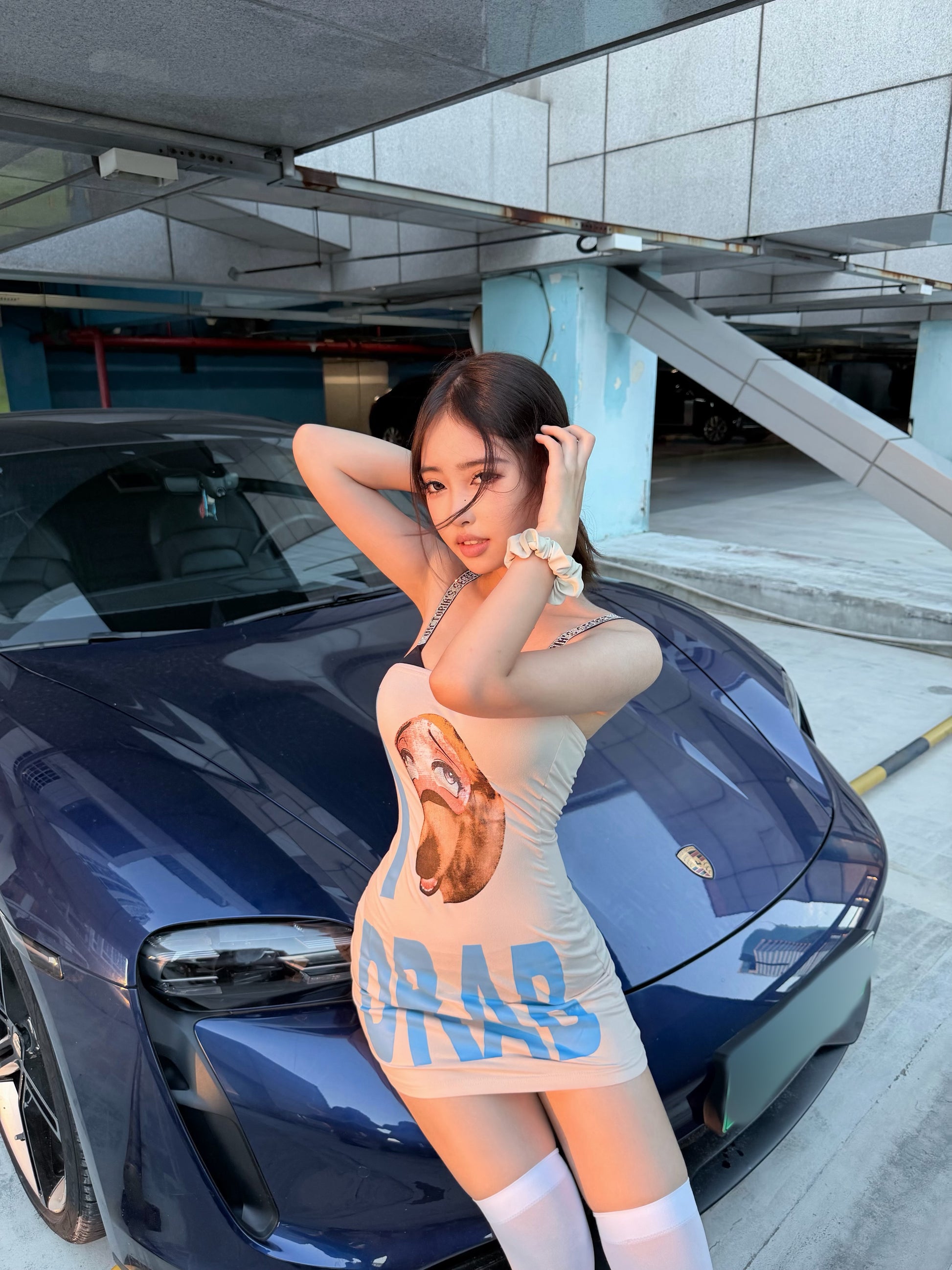 本产品为植绒面料的紧身一片式连衣裙,面料非常亲肤,弹力较大。所有印花采用胶印技术。胸口上摆围有松紧绳位于内里,防止连衣裙滑脱~